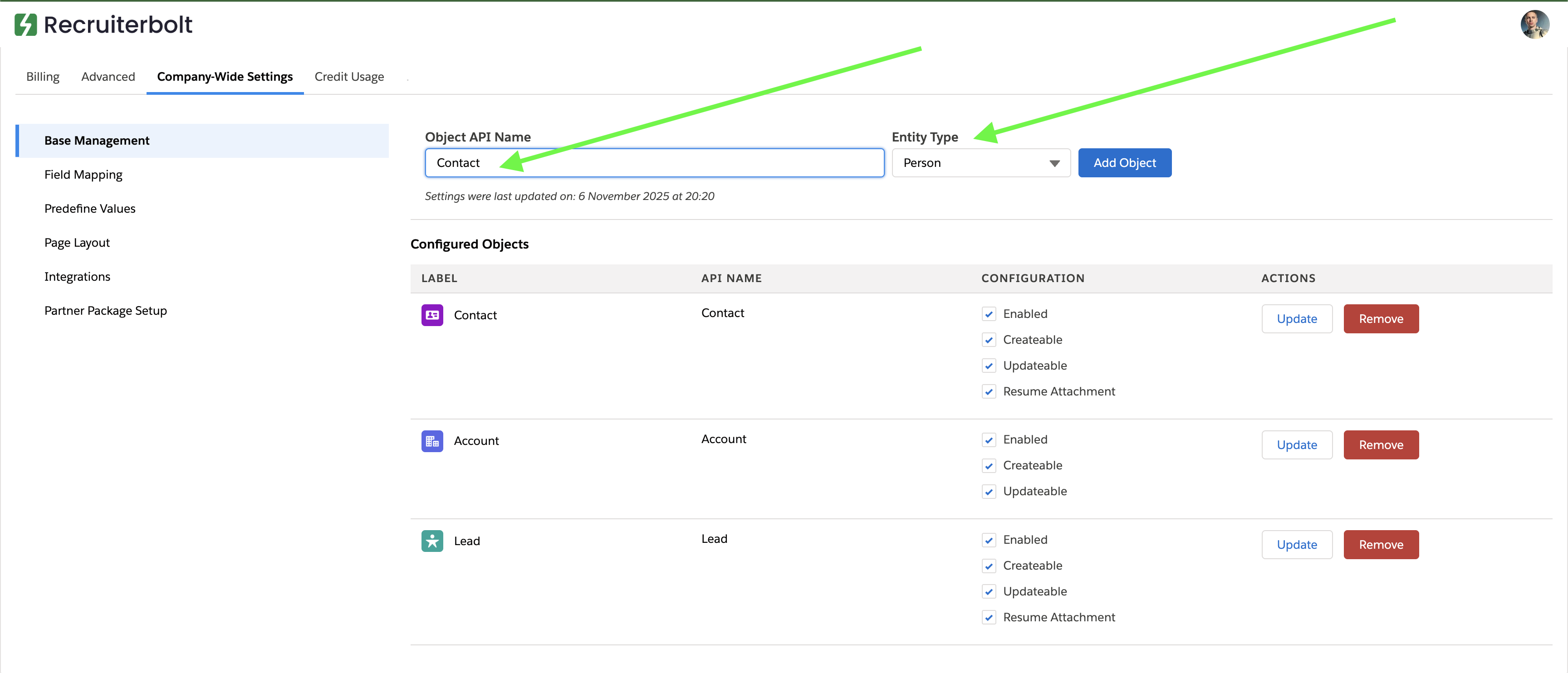 Important: Hitting “Update” under each object in Base Management ensures object configuration is synchronised for the entire org.