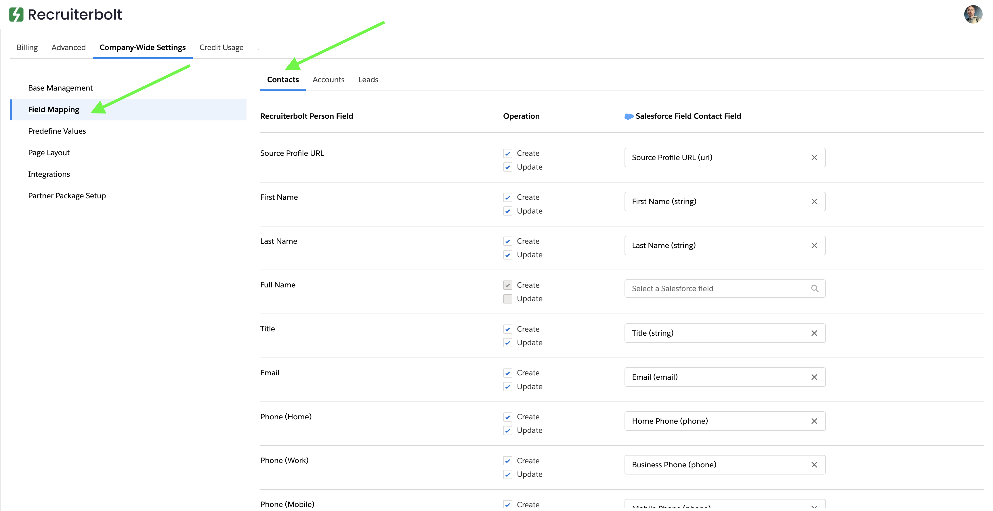 Go to Company-Wide Settings → Field Mapping → Contacts.