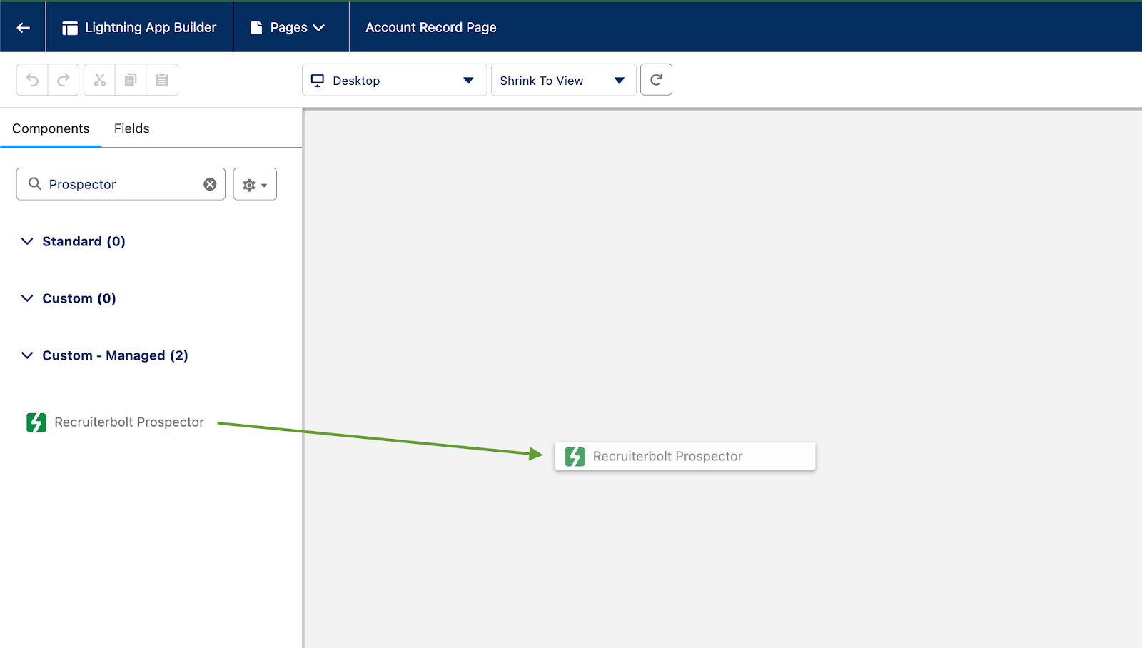 A diagram showing the Salesforce Lightning App Builder, with “Recruiterbolt Prospector” being dragged into the Account page layout.