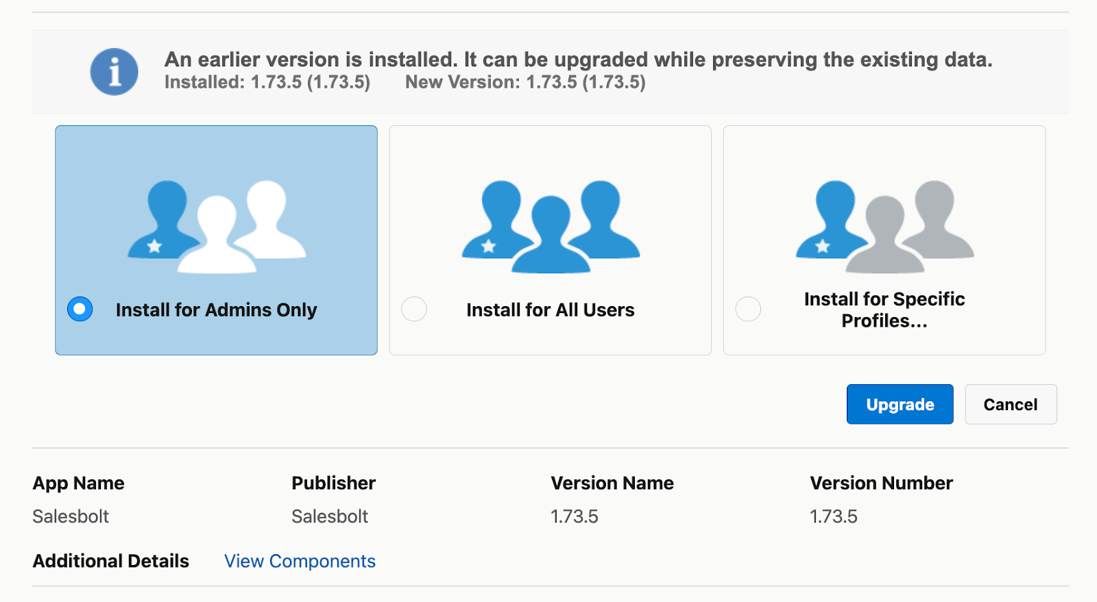 When doing that with any Salesforce Managed Package you will be prompted to this time "Upgrade" you will see the (3) above options here, just select "Install for All Users" before proceeding. You may have already done this while installing, if so you need not do a thing. Just have any other user search for the Salesbolt App within your Salesforce instance.